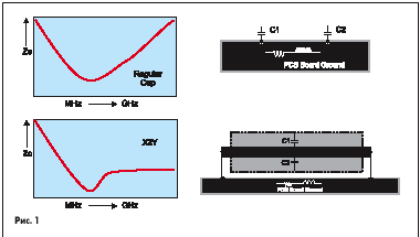 На рис.1 показаны два обычных конденсатора, включенных параллельно, а также подключенный конденсатор X2Y, частотные зависимости их импедансов, из сравнения которых следует выигрышность нового типа конденсатора при работе на частотах выше резонансной.