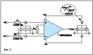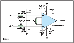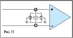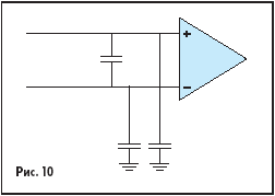 При стандартном выполнении фильтра на входе операционного усилителя (ОУ)(рис.10) требуются три конденсатора, для их монтажа используется значительная площадь; кроме того, конденсаторы должны иметь узкий допуск по емкости для эффективной фильтрации несимметричной (common) составляющей.