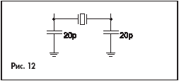 В обычном применении (рис.12) требуются два точно подобранных по емкости конденсатора для лучшего симметрирования схемы с кварцем.