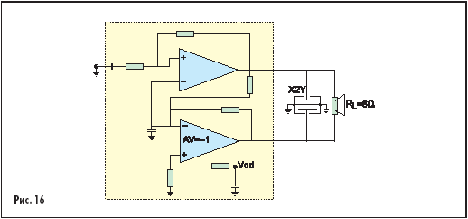При использовании конденсатора X2Y необходим только один такой компонент вместо двух или даже большего числа элементов. Наблюдается лучшая симметрия, допуск на емкость между каждым проводом и землей составляет меньше 3%. Температурный уход и изменения, связанные со старением, оказываются малыми, вследствие того, что X2Y выполняется в одном корпусе. Кроме того при использовании конденсатора X2Y имеет место более широкополосное затухание при фильтрации. Использование конденсатора X2Y в звуковом усилителе показано на рис.16.