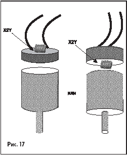 - Конденсатор X2Y наиболее эффективен, когда расположен в том месте металлизированного корпуса, где провода выходят из двигателя. Другими словами, X2Y должен быть последним компонентом, через который проходят помехи при выходе из двигателя (рис.17).