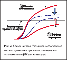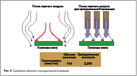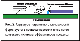 Два самых простых метода нагревания для пайки — это воздушная конвекция и инфракрасный нагрев. При использовании воздуха в качестве средства для передачи тепла конвекция идеальна для нагревания компонентов, которые «выступают » из платы, таких, как выводы и маленькие детали. Однако при этом образуется пограничный слой между горячим воздухом и платой, который делает подачу тепла последней неэффективной (рис.2).