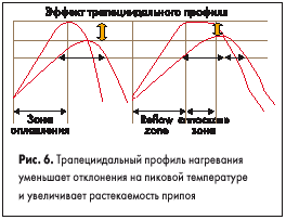 - Использование трапециидального температурного профиля (увеличение времени нагрева с пиковой температурой). Это позволяет компонентам с большой теплоемкостью достичь требуемой температуры и избежать перегрева небольших компонентов. При использовании этого метода, показанного на рис.6, современные комбинированные паяльные системы позволяют снизить разность температур между 45-миллиметровым BGA-корпусом и корпусом типа small outline (SOP) до 8 °С.