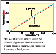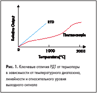 На рис.1 приведены уровни выходных сигналов типичного РДТ и термопары в зависимости от температуры. Как видно, термопары работают в большем температурном диапазоне, чем РДТ, а РДТ имеют больший относительный уровень выходного сигнала по сравнению с термопарами. Кроме того, РДТ более линеен, чем термопара.