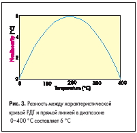Сравнение выходного сигнала РДТ с прямой линией в температурном диапазоне 0 –400 °C показано на рис.2. Этот график дополняется рис.3, на котором отображена разность между прямой линией и характеристической кривой РДТ. Наблюдается разница почти в 6 °C в центре температурного диапазона. Для сравнения на рис.4 показано типовое различие между характеристическими кривыми трех типов термопар и прямой в температурном диапазоне 0 –1000 °C.