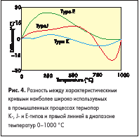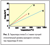 Как видно, термопары K-типа наиболее линейны из всех трех типов в данном температурном диапазоне. Это обстоятельство является одной из причин, по которой они используются в промышленности более широко, чем термопары типов J и E. На рис.5 показан уровень выходного сигнала термопар K-, J-и E-типов как функция температуры.