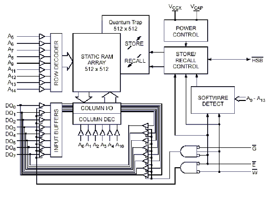 Это высокоскоростная энергонезависимая память с произвольным доступом (по ГОСТУ — запоминающее устройство с произвольной выборкой ЗУПВ), созданная на основе стандартной SRAM, в которую интегрированы элементы EEPROM, выполненные по технологии QuantumTrap™. Реально nvSRAM работает как две независимые памяти — SRAM и EEPROM. Статическая память идентична обычному ЗУПВ, а параллельный доступ к EEPROM возможен только через SRAM (структурная блок-схема — на рис. 1).
