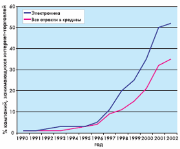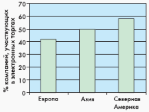 В 2002 году азиатские компании, занимающиеся электроникой, опередили Европу по активности участия в электронной торговле (рис. 3). Устойчивый рост отрасли инициировал бурное развитие виртуальных торговых площадок.