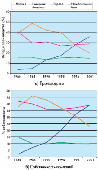 В последние годы на рынке электронных компонентов наметилась тенденция устойчивого укрепления позиций азиатских компаний. Наращивание производства при одновременном перераспределении собственности в пользу стран Юго-Восточной Азии (Тайвань, Сингапур, Гонконг, Филиппины, Малайзия, Южная Корея, Индонезия, Китай) происходило на фоне стагнации в Северной Америке и Европе, а также резкого спада в Японии (рис. 2).