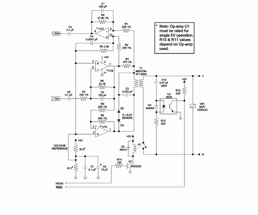 Схема подключения к телефонной линии с однополярным питанием сложнее (рис. 4), но при этом отпадает необходимость в двухполярном источнике. Мостовое включение трансформатора позволяет передавать сигнал без искажений при питании +5 В. Т.к. сигналы тонального набора (DTMF) имеют более высокую амплитуду, чем данные, то они будут отсекаться при использовании усилителя с несимметричным выходом. Этот усилитель (дополнительный ОУ U1A) инвертирует сигнал с выхода ОУ U1B (поступающий на верхний по схеме вывод трансформатора Т1) перед подачей на второй вывод Т1. Приемный усилитель (U1C) шунтирует выходной сигнал и, как следствие, входной сигнал не искажается.