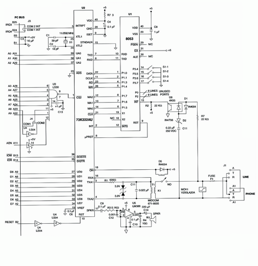 Если у вас нет желания или возможности заниматься блоком сопряжения с телефонной линией, то в этом случае можно использовать модем 73K222BL, в который встроен гибридный ключ для 2/4–проводной линии. Насколько при этом облегчается жизнь разработчика, видно из схемы на рис. 5.