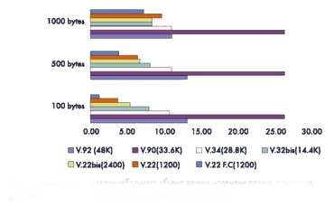 Рис. 1. Общее время передачи небольшого объема данных модемами разных стандартов (установка соединения, передача данных, завершение соединения)