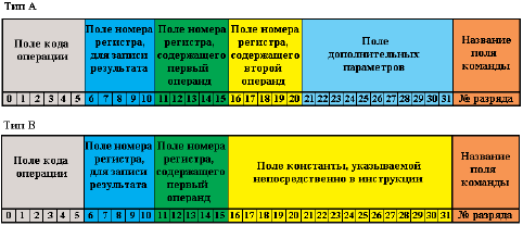 Длина поля кода операции составляет пять двоичных разрядов. Поля команды, используемые для записи номеров регистров, содержат по пять разрядов. Вспомогательное поле, длина которого составляет одиннадцать разрядов, может использоваться для указания дополнительных параметров команды, например, типа операндов. Если дополнительные параметры в инструкции не требуются, то это поле заполняется нулевыми разрядами.