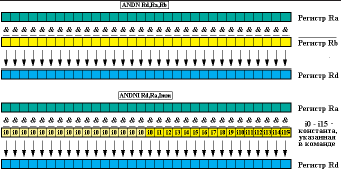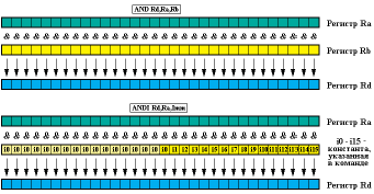 Для поразрядного умножения содержимого двух регистров общего назначения с номерами a и b предназначена команда AND Rd,Ra,Rb. Команда ANDI Rd,Ra,Imm выполняет операцию «Логическое И» над соответствующими разрядами содержимого регистра с номером a и значения, полученного в результате знакового расширения константы Imm до 32-разрядного слова. Рисунок 9 поясняет процесс выполнения этих команд.