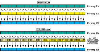 Инструкция XORI Rd,Ra,Imm выполняет поразрядную операцию «Исключающее ИЛИ», в которой участвует содержимое регистра с номером a и значение, полученное в результате знакового расширения константы Imm до 32-разрядного слова. Команда XOR Rd,Ra,Rb осуществляет аналогичную операцию, операндами которой является содержимое двух регистров общего назначения с номерами a и b. Выполнение поразрядных операций «Исключающее ИЛИ» демонстрирует рис. 12.