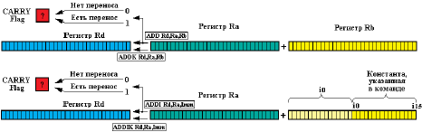 Команды ADD Rd,Ra,Rb и ADDK Rd,Ra,Rb выполняют сложение содержимого двух регистров общего назначения с номерами a и b без учета переноса. Инструкции ADDI Rd,Ra, Imm и ADDIK Rd,Ra,Imm предназначены для суммирования без учета переноса содержимого регистра общего назначения с номером a и значения, которое является результатом знакового расширения 16-разрядной константы Imm до 32-разрядного слова. Если инструкции ADDI или ADDIK предшествует команда IMM, то указанное в ней значение используется в качестве 16 старших разрядов второго слагаемого. Значение суммы, полученное в результате выполнения рассмотренных команд, записывается в регистр с номером d. После исполнения команд сложения ADD и ADDI флаг переноса (займа) Carry Flag (29-й разряд регистра статуса) устанавливается в состояние высокого логического уровня в том случае, если в результате выполненной операции происходит перенос из самого старшего разряда. В противном случае этот флаг переключается в сброшенное состояние (низкого логического уровня). В отличие от команд ADD и ADDI инструкции ADDK и ADDIK позволяют реализовать аналогичные операции, не изменяя при этом состояние флага переноса (займа) Carry Flag. Рисунок 2 в наглядной форме поясняет выполнение операций сложения без учета переноса.