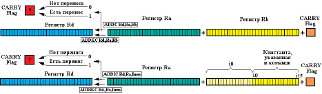 Команды ADDC Rd,Ra,Rb и ADDKC Rd,Ra,Rb используются для вычисления суммы содержимого двух регистров общего назначения с номерами a и b с учетом состояния флага переноса перед выполнением этой операции.