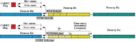 Инструкции RSUBKC и RSUBIKC применяются в том случае, когда при выполнении операции вычитания с учетом займа необходимо сохранить исходное состояние флага переноса (займа). Рисунок 5 иллюстрирует выполнение операций вычитания с учетом займа.