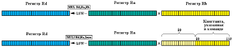 Команда MUL Rd,Ra,Rb предназначена для перемножения содержимого двух регистров общего назначения с номерами b и a. В инструкции MULI Rd,Ra,Imm первым сомножителем является значение содержимого регистра с номером a. В качестве второго сомножителя выступает значение, полученное в результате знакового расширения 16-разрядной константы Imm, которая задается непосредственно в инструкции, до 32-разрядного слова. Если инструкции MULI предшествует команда IMM, то указанное в ней значение используется в качестве 16 старших разрядов второго сомножителя. Результат применения команд умножения MUL и MULI представляет собой 64-разрядное значение. Старшие 32 разряда произведения отбрасываются, а младшие записываются в регистр общего назначения с номером d, который указывается в качестве первого параметра инструкций умножения. Осуществление операций умножения двух операндов показано на рис. 6. Обозначение LSW (Least Significant Word), используемое на этом рисунке, соответствует процедуре выделения последнего (младшего) 32-разрядного слова в значении результата операции.
