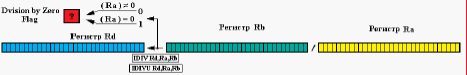 Если содержимое регистра делителя представляет собой нулевое значение, то флаг деления на ноль Divide_By_Zero Flag (25-й разряд регистра статуса) устанавливается в состояние высокого логического уровня. При этом в регистр, предназначенный для записи результата, заносится нулевое значение. В случае, когда значение делителя отличается от нуля, флаг Divide_By_Zero Flag находится в сброшенном состоянии. Рисунок 7 иллюстрирует выполнение операций целочисленного деления.