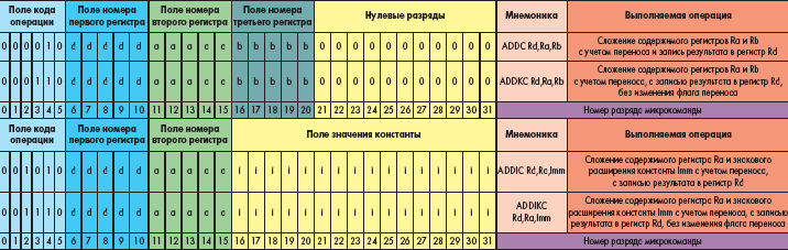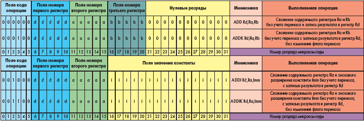 В системе команд микропроцессорного ядра MicroBlaze представлены восемь вариантов инструкций, предназначенных для выполнения операций сложения. Для вычисления суммы двух 32-разрядных слагаемых без учета переноса используются инструкции ADD, ADDK, ADDI и ADDIK, форматы которых представлены в таблице 1.