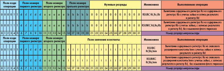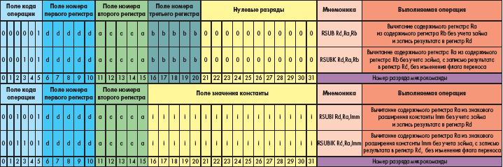 Для выполнения операций вычитания предусмотрены восемь вариантов инструкций. Вычисление разности двух операндов без учета займа выполняется с помощью инструкций RSUB, RSUBK, RSUBI и RSUBIK, форматы которых представлены в таблице 3.