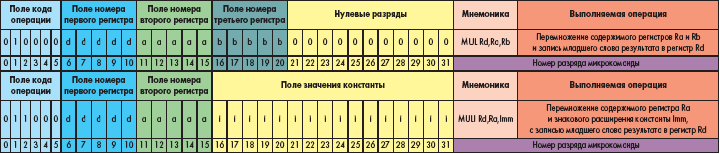 Инструкции умножения поддерживаются только теми элементами семейства микропроцессорных ядер MicroBlaze, которые реализуются на основе ПЛИС, имеющих в своем составе встроенный аппаратный умножитель. Для выполнения операций умножения двух 32-разрядных операндов предусмотрены две разновидности инструкций, форматы которых представлены в таблице 5.