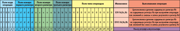 Система команд семейства микропроцессорных ядер MicroBlaze содержит два варианта команд целочисленного деления, которые доступны только элементам, реализуемым на основе кристаллов FPGA, обладающих встроенными аппаратными умножителями. При этом в процессе описания конфигурации ядра должна быть указана опция использования встроенного аппаратного делителя. Форматы команд целочисленного деления IDIV и IDIVU приведены в таблице 6.
