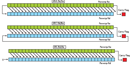 Как видно из рис. 14, при использовании дополнительных сдвиговых команд циклический или арифметический сдвиг данных производится без участия разряда переноса (займа) CARRY Flag регистра статуса.