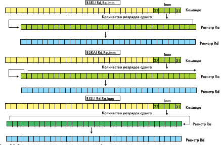 В команде BSRLI значение N указывается непосредственно в виде константы Imm. Условные изображения, приведенные на рис. 14, поясняют выполнение дополнительных команд арифметического и циклического сдвига данных.