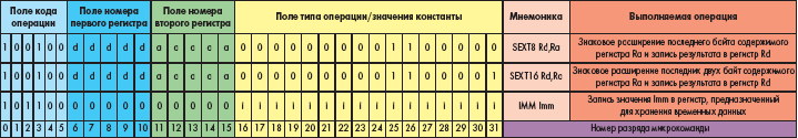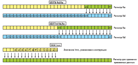 Команда SEXT8 Rd,Ra предназначена для выполнения операции знакового расширения однобайтового значения, которое содержится в регистре общего назначения с номером a, до 32-разрядного слова. Для осуществления операции знакового расширения 2-байтового значения, которое находится в регистре с номером a, используется инструкция SEXT16 Rd,Ra. Результат преобразования данных, выполняемого с помощью команд SEXT8 и SEXT16, записывается в регистр общего назначения с номером d. Процесс выполнения инструкций преобразования типов данных демонстрирует рисунок 15.