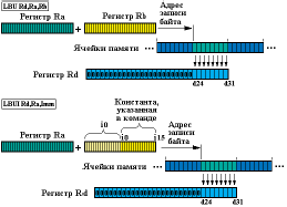 Инструкции LBU Rd,Ra,Rb и LBUI Rd,Ra,Imm используются для передачи байта данных из памяти в регистр общего назначения с номером d при различных способах определения значения смещения. Передаваемые данные записываются в младшие восемь разрядов регистра Rd. В остальные разряды этого регистра заносится нулевое значение. Рисунок 16 иллюстрирует выполнение операций побайтной загрузки данных.