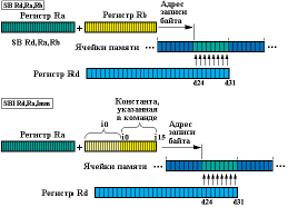 Запись младшего байта данных из регистра с номером d в память по адресу, равному сумме значений содержимого регистров с номерами a и b или содержимого регистра Ra и результата знакового расширения константы Imm, осуществляется с помощью команд SB Rd,Ra,Rb и SBI Rd,Ra,Imm соответственно. Рисунке 19 поясняет выполнение операций побайтной передачи данных из регистра общего назначения в память.