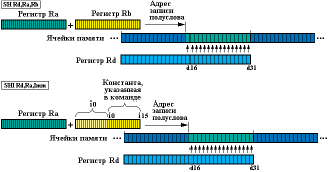 Инструкции SH Rd,Ra,Rb и SHI Rd,Ra,Imm используются для передачи полуслова данных, состоящего из двух младших байт содержимого регистра общего назначения с номером d, в память. Выполнение команд записи полуслова данных из регистра общего назначения в память иллюстрирует рисунок 20.