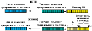 В случае применения инструкций переходов, использующих относительную адресацию, исполнительный адрес вычисляется как сумма текущего значения содержимого программного счетчика и смещения, задаваемого в виде значения соответствующего параметра команды. Для определения значения адреса перехода (при абсолютной адресации) или смещения (при относительной адресации) может применяться регистровый косвенный или непосредственный способы.