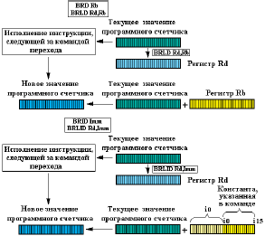 Большинство команд безусловных переходов представлено в двух вариантах: с немедленной передачей управления и с задержкой исполнения. При выполнении инструкции с немедленной передачей управления загрузка нового значения (адреса перехода) в программный счетчик осуществляется сразу же после завершения обработки этой команды.