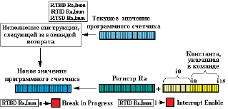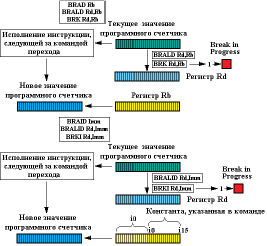 Инструкции BRK Rd,Rb и BRKI Rd,Imm предназначены для реализации в программе режима Break с передачей управления по указанному адресу. В этих командах применяется абсолютная адресация. Первым параметром в данных инструкциях является номер одного из регистров общего назначения, который используется для записи значения текущего состояния программного счетчика. Содержимое этого регистра впоследствии может использоваться в процессе вычисления адреса возврата при выполнении соответствующей инструкции. В качестве значения второго параметра команды BRK также указывается номер регистра, содержимое которого определяет адрес передачи управления. В инструкции BRKI адрес перехода представляет собой результат знакового расширения 16-разрядной константы Imm, указанной непосредственно в инструкции, до 32-разрядного слова. При исполнении рассмотренных команд флаг Break in Progress Flag (28-й разряд регистра статуса) переключается в установленное состояние. Процесс выполнения команд BRK и BRKI иллюстрирует рисунок 26.