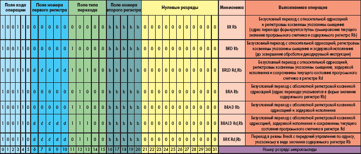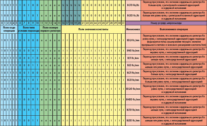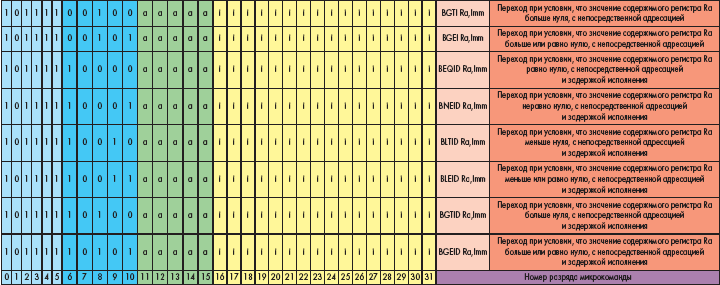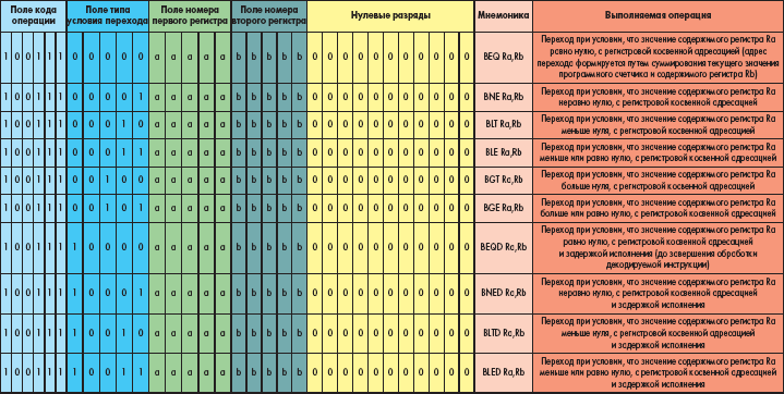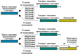 Инструкции BEQ Ra,Rb и BEQI Ra,Imm инициируют передачу управления по заданному адресу при условии, что значение содержимого регистра общего назначения с номером a равно нулю. Адрес перехода формируется путем суммирования текущего значения программного счетчика и смещения, которое указывается в виде содержимого регистра Rb (в команде BEQ) или результата знакового расширения 16-разрядной константы Imm до 32-разрядного слова (в команде BEQI). При исполнении команд BNE Ra,Rb и BNEI Ra,Imm управление передается инструкции с указанным адресом только в случае, если значение содержимого регистра общего назначения с номером a неравно нулю. Инструкции BLT Ra,Rb и BLTI Ra,Imm загружают новое значение адреса в программный счетчик при условии, что значение содержимого регистра Ra меньше нуля.