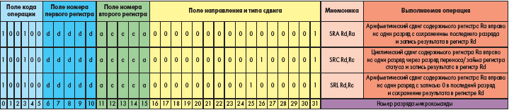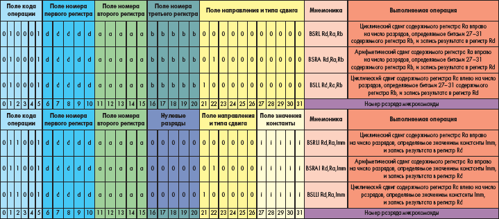 Для осуществления операции циклического сдвига данных, хранящихся в регистре с номером a, вправо на N разрядов предусмотрены команды BSRL Rd,Ra,Rb и BSRLI Rd,Ra,Imm. При использовании инструкции BSRL значение N определяют последние пять разрядов содержимого регистра с номером b.