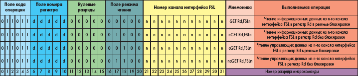 Система команд микропроцессорного ядра MicroBlaze включает в себя четыре инструкции, предназначенные для чтения данных различного типа, поступающих через входной интерфейс FSL. Информация о форматах этих команд содержится в таблице 20.