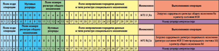 Команда MFS Rd,Sa выполняет копирование содержимого одного из регистров специального назначения Sa в регистр общего назначения с номером d. При использовании в инструкции MFS в качестве второго параметра S1 производится копирование содержимого регистра состояния MSR. Если в качестве второго параметра указано значение S0, то в регистр общего назначения Rd записывается содержимое программного счетчика. Рисунок 32 иллюстрирует выполнение специальных инструкций.