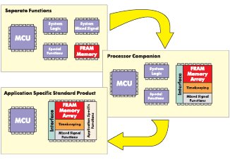 В микросхемах семейства Processor Companion технология FRAM используется не только в основном массиве памяти, но и во вспомогательных регистрах каждого из функциональных узлов, что обеспечивает энергонезависимое хранение переменных значений, быстрое их обновление и огромное количество циклов модификации, а также низкое энергопотребление в активном режиме.
