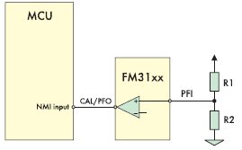 В FM31, FM32 и FM4005 Reset-генератор допускает также внешний запуск (Manual Reset) с 100-милисекундной защитой от дребезга. В этих сериях есть также схема PFI/PFO, предназначенная для раннего обнаружения аварий по питанию и генерации немаскируемого прерывания (NMI). По существу, это компаратор общего назначения с встроенным источником опорного напряжения 1,2 В. Его можно использовать для различных задач, но основной областью применения предполагается мониторинг напряжения в точке до системных стабилизаторов и фильтров. Таким образом, падение напряжения питания PFI/PFO обнаруживает гораздо раньше, чем PSM, тем самым предоставляя больше времени контроллеру на обработку аварийного события.