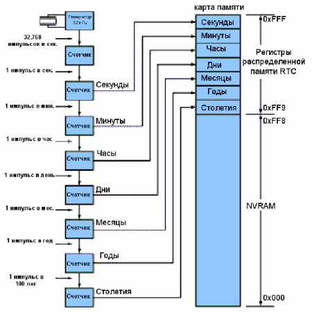 Данные на выходах счетчиков соответствуют текущему времени и дате. Эти параметры переносятся в область распределенной памяти NVRAM и фигурируют как обыкновенные адреса ячеек ОЗУ. Пользователи считывают/записывают время и дату путем чтения/записи этих адресов в пространстве NVRAM.