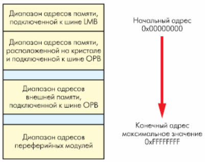 В начальной секции адресного пространства располагается диапазон адресов, зарезервированный для памяти, которая расположена непосредственно на кристалле и сопряжена с микропроцессорным ядром по локальной шине LMB. Следующий диапазон адресов предназначен для внутренней памяти ПЛИС, доступ к которой осуществляется по шине OPB. Далее, в направлении увеличения значения адреса, следует диапазон адресов внешней памяти, подключенной к шине OPB. В конечной секции адресного пространства памяти обычно находится диапазон адресов периферийных модулей проектируемой микропроцессорной системы. Между перечисленными диапазонами адресов в общем случае могут присутствовать неиспользуемые интервалы адресного пространства.