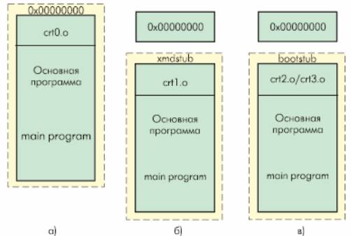 Для того чтобы сформировать объектный код разрабатываемой прикладной программы, соответствующий одному из рассмотренных выше сценариев выполнения, следует воспользоваться специальными параметрами компилятора. Параметр -xl-mode-executable используется для компиляции прикладных программ, не требующих при выполнении поддержки средств отладки и автозагрузки. Параметр -xl-mode-xmdstub применяется в процессе компиляции программ, которые должны выполняться в режиме отладки. Параметры компилятора -xl-modebootstrap-xl-mode-bootstrap-reset предназначены для генерации объектного кода прикладных программ, которые должны поддерживать режим автозагрузки.