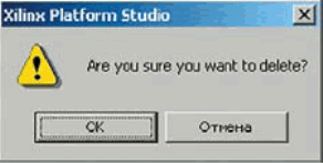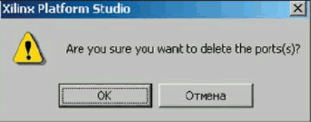 и щелкнув левой кнопкой мыши. Затем необходимо нажать кнопку Del, находящуюся несколько ниже кнопки Add Port, в результате чего на экран будет выведена диалоговая панель, в которой содержится запрос подтверждения на удаление выбранного порта компонента из спецификации аппаратной платформы (рис. 10). При утвердительном ответе на запрос (нажатии кнопки ОК, расположенной в нижней части панели запроса) выбранные строки таблицы и описание подключения соответствующих портов будут удалены из спецификации MHS.