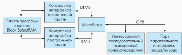 - программная и оперативная память, реализуемая на основе блочной памяти ПЛИС Block SelectRAM;