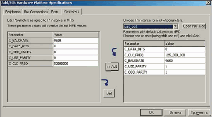 В первой колонке (Parameter) перечисляются все параметры выбранного экземпляра компонента, а во второй (Value) — значения этих параметров, установленные по умолчанию. Для того чтобы получить исчерпывающую информацию о назначении параметров выбранного компонента и их допустимых значениях, следует обратиться к документации, в которой содержится детальное описание данного компонента. Кнопка Open PDF Doc, расположенная правее поля выбора, позволяет открыть соответствующий документ (в формате PDF) непосредственно из среды управляющей оболочки Xilinx Platform Studio. При этом предполагается, что на используемом компьютере установлена программа Acrobat Reader фирмы Adobe.