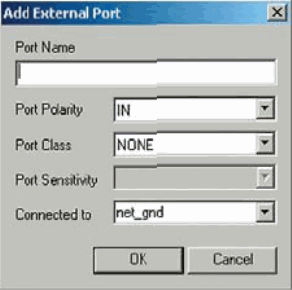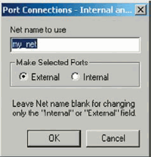 Для подключения порта к некоторой цепи системы или изменения статуса порта нужно выделить соответствующую строку в таблице, находящейся в левой части страницы Ports, после чего воспользоваться кнопкой Connect, которая расположена под кнопкой Del. При нажатии этой кнопки на экран выводится диалоговая панель, представленная на рис. 9. В поле редактирования с помощью клавиатуры указывается идентификатор цепи, к которой должен быть подключен выбранный порт. Статус этого порта устанавливается путем нажатия одной из двух кнопок с зависимой фиксацией: External или Internal. Все выполненные изменения вступают в силу после нажатия кнопки ОК, расположенной в нижней части диалоговой панели (рис. 9), после чего автоматически отображаются в таблице на странице Ports.